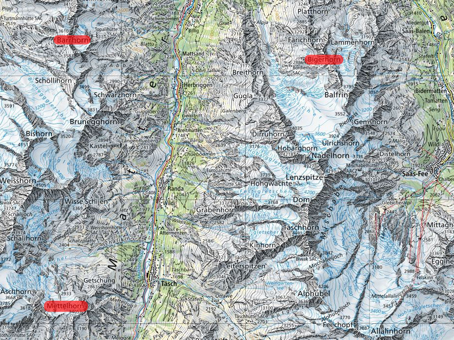 Unsere Reise führt uns ins Wallis. Eingebettet in eine grandiose Kulisse der höchsten Alpenberge finden wir ein wahres Eldorado für unser geplantes Abenteuer. Erst seit Kurzem gilt das Gross Bigerhorn als eine Folge des Gletscherrückganges mit 3.626 Metern als der höchste Wandergipfel Europas und hat damit das unwesentlich niedrigere Üssers Barrhorn (3.610 m) entthront. Das Mettelhorn (3.405 m) hoch über Zermatt ist ein bewährter Aussichtsberg-Klassiker und macht unsere Trilogie komplett.